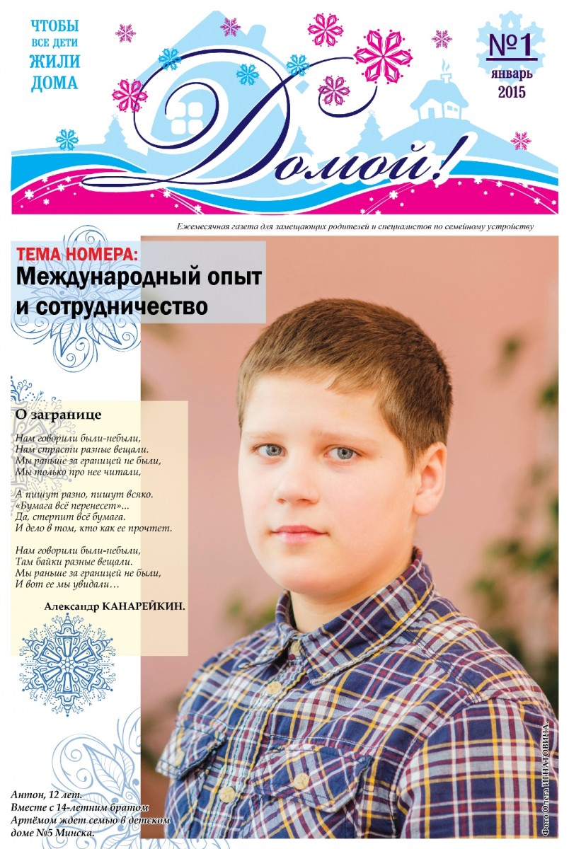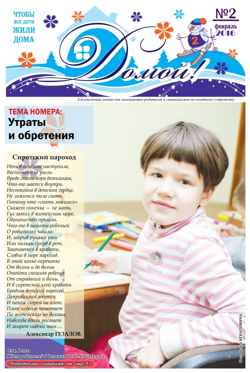 Приглашаем уважаемых коллег к сотрудничеству в газете «ДОМОЙ!»: присылайте текстовые и фото-материалы о различных направлениях своей работы по семейному устройству детей, будем рады разместить информацию о семьях Вашего района, принявших на воспитание детей-сирот и детей, оставшихся без попечения родителей, задавайте вопросы в адрес мультидисциплинарной команды специалистов по различным аспектам семейного устройства (в команде работают юрист, педагог, психолог), делитесь своими проблемами и достижениями в деле воспитания детей с особенной судьбой, создания и сопровождения замещающих семей различных типов. Материалы, вопросы и пожелания газете присылайте на электронные адреса: