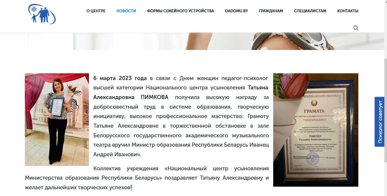 06.03.2023 на сайте учреждения и других интернет ресурсах размещена новость о награждении педагога-психолога Национального центра усыновления Пимковой Татьяны Александровны грамотой Министерства образования Республики Беларусь