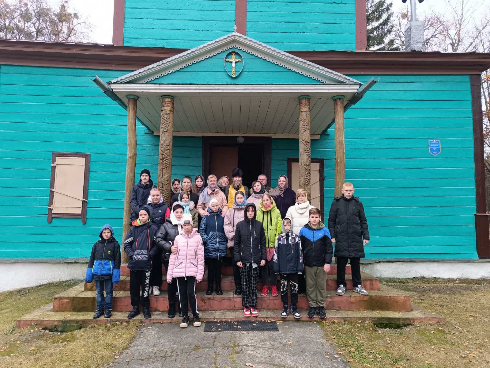 Первой остановкой в маршруте была Свято-Космо-Дамиановская церковь, которой в этом году исполнилось 210 лет. Церковь является памятником народного деревянного зодчества. Это один из старейших храмов Могилевской области. Ребята с интересом слушали рассказ отца Николая о храме.